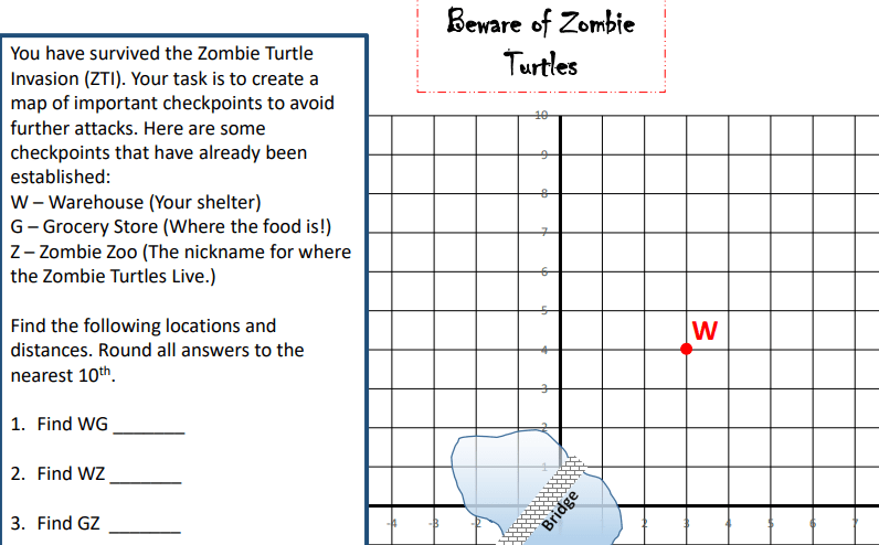 The last part of this activity is a silly made up story that I call the Zombie Turtle Problem. (Have you ever heard the Tom Petty song, Zombie Zoo? This song inspired me to do this problem. The song is silly but I love it.) I’ve placed some items on a map and the students have to find different distances and midpoints and then I tie in perimeter. Here’s a snippet of the problem:
