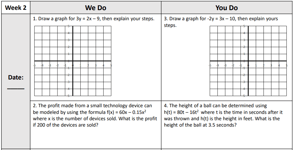 Another option is “We Do, You Do”. Together with the class, the teacher works through 1 and 2 and then lets the students work by themselves on 3 and 4. In this format, the teacher will begin class working the problems. When students work the other two, she can go do her attendance and other tasks. This approach is good when you have students that have a hard time starting. The example below is from my Algebra Review Bell Ringers.