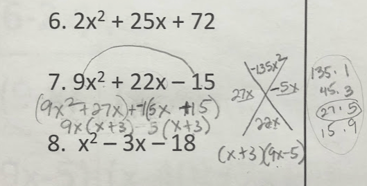 Look at the sample factoring problem below this paragraph. I have my students multiply the 9x^2 and the -15. The answer is -135x^2. To the right of the problem, they draw a large X . On the top, they write the -135x^2 and on the bottom of the X, they write the middle term: 22x. Next, they start making a list of all of the factors of 135. I tell them not to think about the negative at first…just make a list of factors. If they are not able to do that, then use the calculator to make the list. Once the list is made, then the students decide which factors will multiply to get -135 and subtract to get 22. The answer would be 27 and -5. Those two numbers are written on the left and right side of the X. Next, the original trinomial is turned into a polynomial with four terms. The second step below was 9x^2 + 27x – 5x – 15, before I started the grouping process. The problem is grouped and the factors are found. (Yes, I teach grouping. It helps with this type of problem and it helps with factoring out a GCF. Don’t skip grouping. If you’d like to see more about how I teach factoring go to this Factoring Blog Post.)