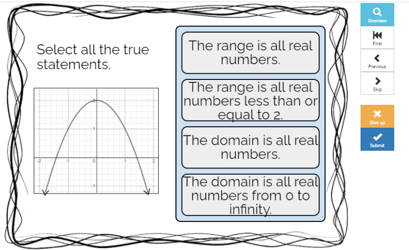Why is domain and range so tough for students? I’ve really worked on slowing down and teaching domain and range in detail the past few years. The idea that students are asked to find all the x’s and y’s that belong to a graph or situation is overwhelming. I believe part of the problem is that the concept is abstract. It’s not physically possible to name all the points that exist on a line. Students are not digging deep and realizing what the line or curve is really displaying (or saying). We’ve got to get them to see the details on the graph. Where does it start? Where does it end? What is happening between? I’ve created some online items that have worked well recently, but I have some older resources that I like to use too.